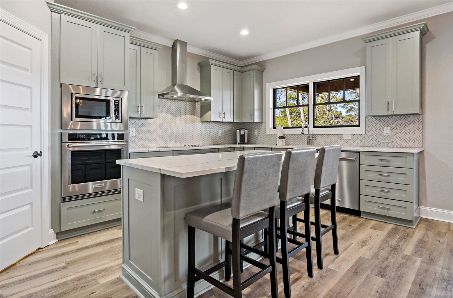 The main level offers a spacious kitchen where everyone can gather, a dining area, a living room with a gas-log fireplace, a game room, and a really nice master suite.